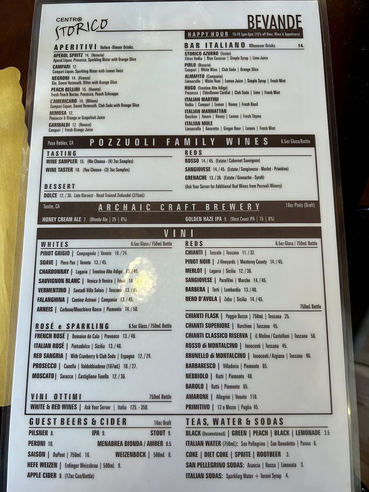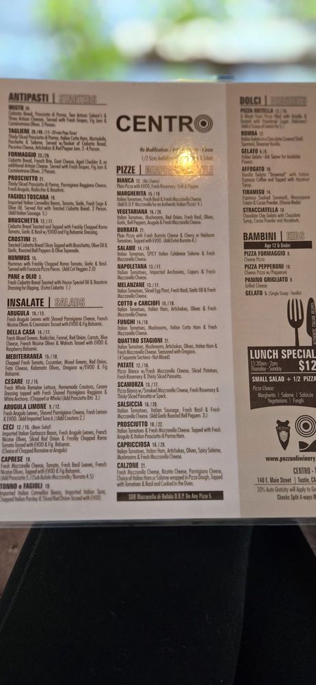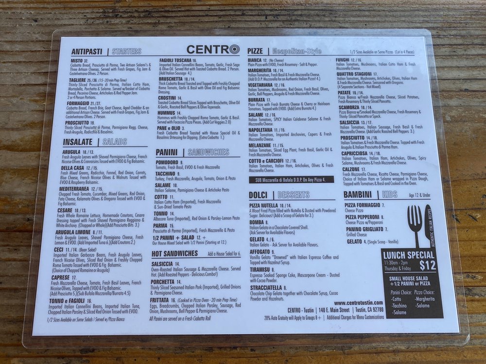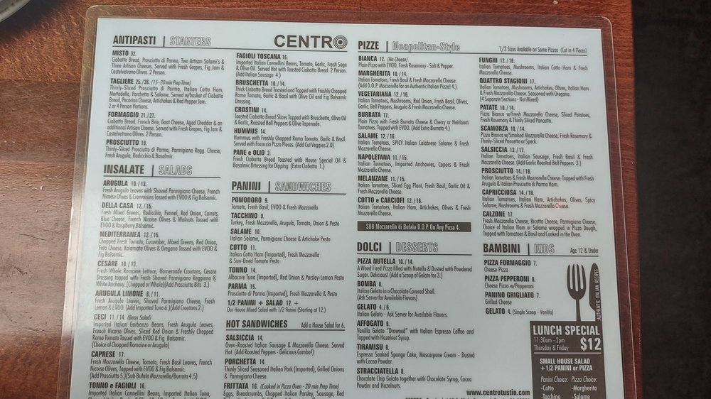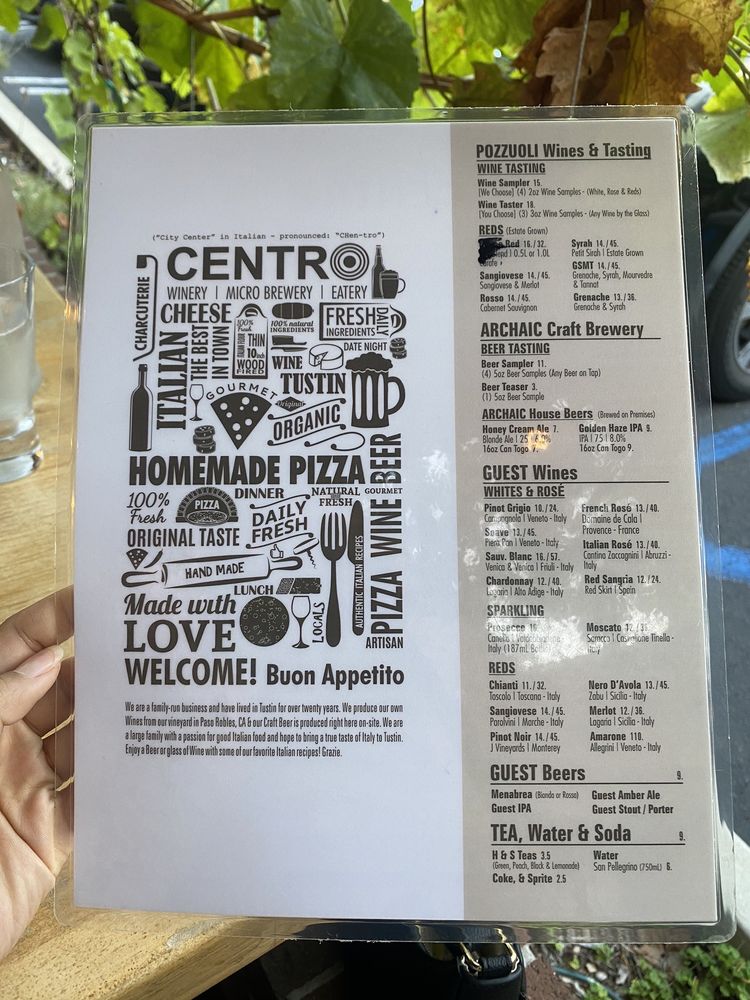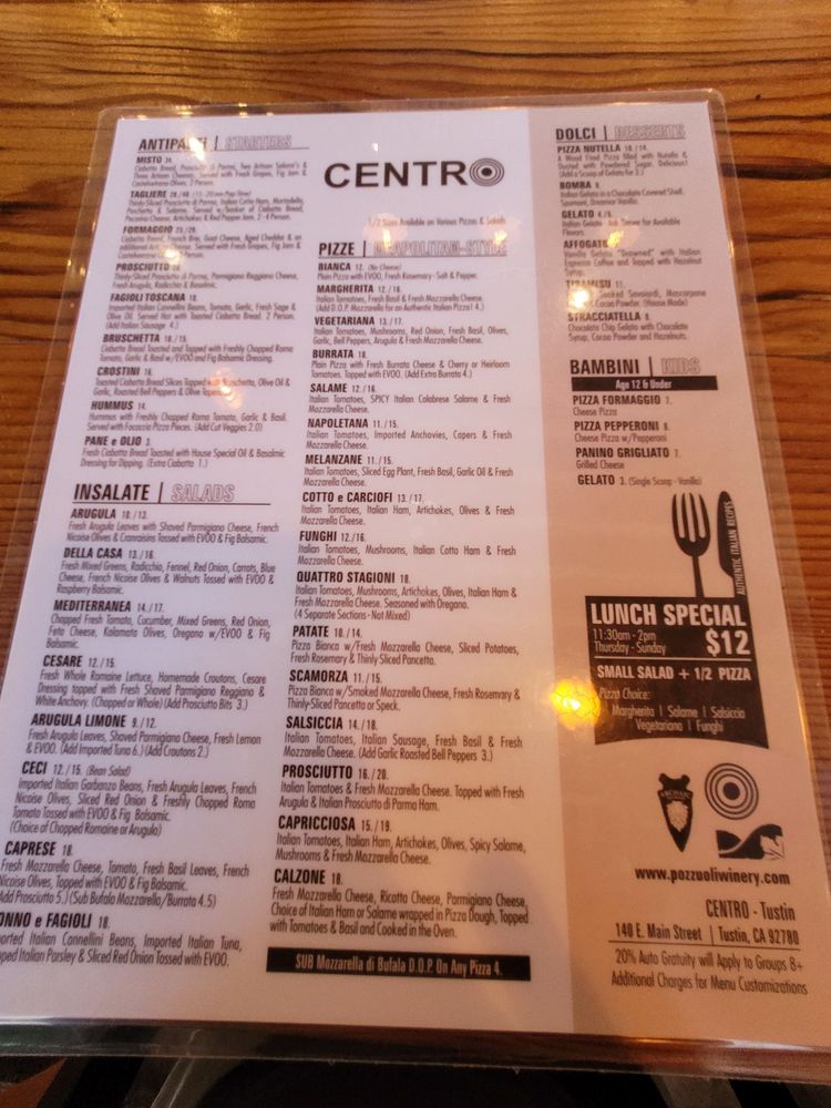 Centro is a charming restaurant located in Tustin, CA that offers a unique blend of Breweries, Wine Bars, and Pizza. Known for its cozy atmosphere and friendly staff, Centro is a hidden gem for those seeking simple yet delicious food. The brick oven pizzas, topped with fresh ingredients, are a standout on the menu. Customers rave about the flavorful salads, appetizers, and wine selection. The establishment provides a variety of dining options, from indoor seating to outdoor tables, perfect for a casual lunch or dinner. With options for vegans and vegetarians, Centro caters to a diverse range of palates. Overall, Centro is a must-visit spot for anyone looking to enjoy quality food in a relaxed setting.